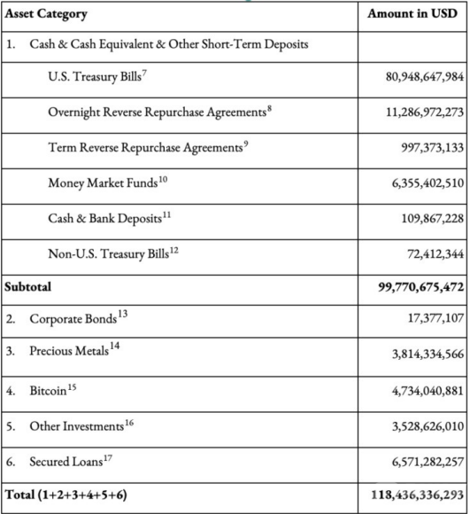 截至第二季度,Tether的USDT發行量為83億美元,總市值達1144億美元,占據了穩定幣市場約七成的份額。公司目前的凈資產高達119億美元,持有的資產包括債券,基金,公司債,金屬以及部分現金。此外,Tether還持有約八萬個Bitcoin。為了保證貨幣的穩定,公司準備了53億美元的超額儲備金。盡管持有Bitcoin的賬面浮虧約為6.53億美元,但同時持有黃金的賬面浮盈1.65億美元,部分抵消了虧損。這顯示出公司在投資組合中進行了有效的風險管理,通過持有穩定資產如黃金來對沖Bitcoin等波動較大資產的風險。