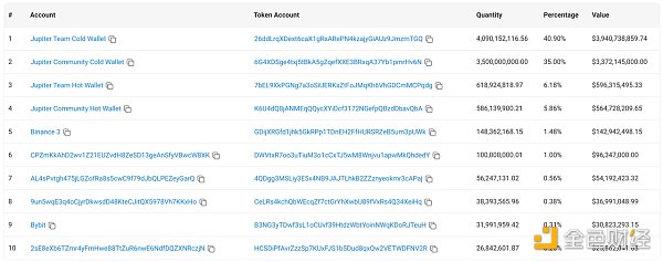 JUP 的日交易量 1.54 億美元,其流通市值約為 13.3057 億美元,換手率有 11.57% ,屬于中等水平。前十名Tokens持有地址