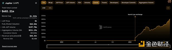 可以看出近半年以來 Jupiter 的 TVL 一直在增長,現已經達到了 6.02 億美元。日交易量