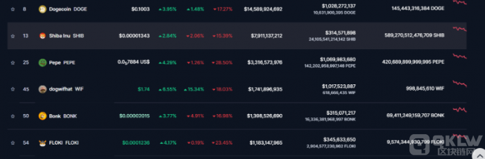 Dogwifhat 當(dāng)前在 memecoin 市場中排名第四,市值遜色于 Pepe(PEPE),后者的市值接近33億美元,是 Dogwifhat 的兩倍。
