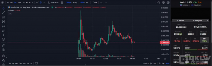 Raydium數據顯示,YEAH上線半個小時左右便迎來了一波拉盤,其市值也在同一時間內攀升至200萬美元,但隨著對談的結束其價格大幅暴跌。