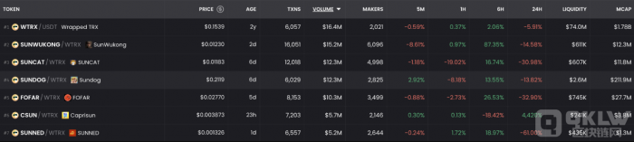 $SUNDOG:開(kāi)盤價(jià)格最低為0.000036 TRX,在20日最高漲至2.32 TRX,漲幅高達(dá)6,444,400%。目前價(jià)格回落至1.38 TRX,市值為2.12億美元。
