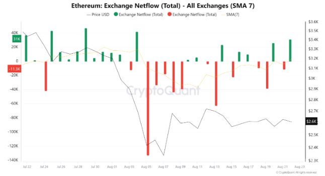 與此同時(shí),交易所的凈流入也顯示出相似的趨勢。周五,Ethereum的交易所凈流入達(dá)到31,000 ETH,這是自8月5日市場崩盤以來的最高水平。這一現(xiàn)象表明市場的拋售壓力正在增加,可能進(jìn)一步拉低價(jià)格。