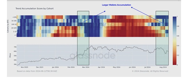 這張圖表展示的是Bitcoin不同持倉規(guī)模群體的**“趨勢積累分數”**(TrendAccumulationScore)隨時間的變化情況,顏色越藍代表著鏈上持幣者傾向于持有或者買入,越紅代表著投資者越傾向于賣出。