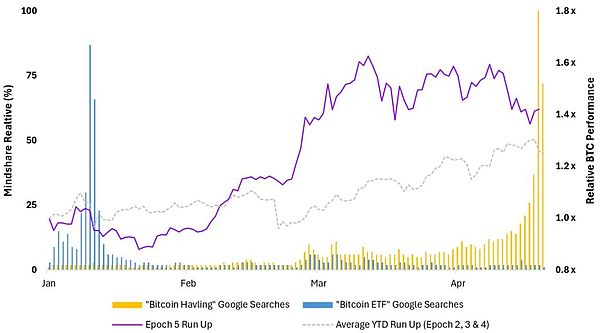 認為4年周期在2024年仍然有效,但2024年1月BTCETF的批準提前了需求,導致BTC在減半前強勁上漲的觀點是錯誤的。BTCETF的批準是需求驅動的催化劑,而減半則是供應驅動的催化劑,因此兩者并不相互排斥。