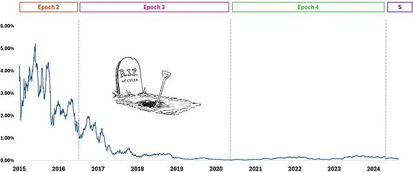 我們認為,2016年是對Bitcoin產生重大、根本性影響的最后一次減半。自那以后,在加密市場日益成熟和多樣化的背景下,礦工的BTC區塊獎勵規模變得微不足道。