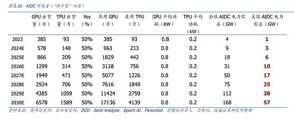 研究公司SemiAnalysis利用了5000多個數據中心的分析和建設預測,并將這些數據與全球數據以及衛星圖像分析相結合,預計未來幾年數據中心電力容量增長將加速至25%的復合年增長率,同時AIDC占比將進一步提升,數據中心方面,根據預測數據,全球數據中心關鍵IT電力需求將從23年的49GW激增到26年的96GW,我們假設27-30年繼續保持數據中心25%的復合增速(參考2023到2026年增速,為25%),那么到29、30年全球數據中心關鍵IT電力需求分別增長至188、234GW;參考SemiAnalysis數據,結合AI算力蓬勃發展、下游應用陸續爆發大背景,我們認為未來AI在數據中心中占比有望持續加速提升,因此我們假設23-30年全球AIDC占比分別達到12%/16%/30%/44%/56%/68%/78%/88%,從而計算出29、30年全球的AIDCIT設備電力需求分別為65GW、91GW。