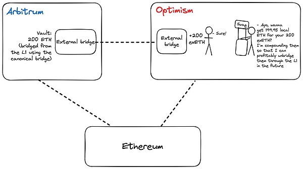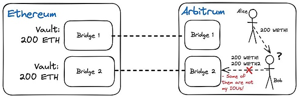 追求效率的Rollup用戶必須使用其他跨鏈橋提供商,這些提供商可以承擔(dān)待處理的Rollup退出的所有權(quán),并在用戶期望的目標(biāo)鏈上提供即時(shí)流動(dòng)性。當(dāng)此類(lèi)橋使用傳統(tǒng)的鎖定與鑄幣模型時(shí),我們最終會(huì)得到由不同協(xié)議發(fā)行的Tokens的多個(gè)包裝Tokens,并面臨前文描述過(guò)的相同問(wèn)題。