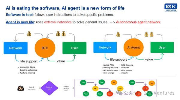 短期內(nèi),賦予Agent更便捷的加密支付的能力,足以擴(kuò)展它們的行動(dòng)范圍。從中長(zhǎng)期來(lái)看,基于加密網(wǎng)絡(luò)的數(shù)字身份、無(wú)許可協(xié)議、去中心化應(yīng)用,以及智能合約賦予的能力,將使Agent能夠在數(shù)字世界中自主運(yùn)作,與人類和其他Agent合作、競(jìng)爭(zhēng)、博弈。加密網(wǎng)絡(luò)不僅為Agent提供了自主行動(dòng)的基礎(chǔ),也為未來(lái)人機(jī)協(xié)作的經(jīng)濟(jì)模式開(kāi)辟了新的可能性——當(dāng)Agent能夠自主參與經(jīng)濟(jì)活動(dòng),這一發(fā)展將為社會(huì)帶來(lái)巨大的變革。(以上是我們LP王超哥,寫得太好了,我得把原文放上來(lái)。)