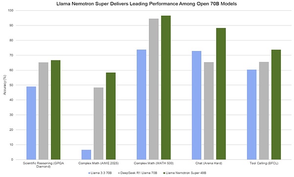 DeepSeekR1蒸餾過的Llama70B模型。不過考慮到最近QwenQwQ32B模型之類的小參數高能模型頻繁發布,LlamaNemotronSuper估計在這些能和R1本體掰手腕的模型里難以出彩。