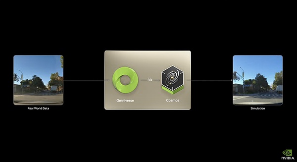 整個模型包含三部分能力,第一部分CosmosTransfer將結構化的視頻文字輸入轉換為可控的真實感視頻輸出,憑空用文字產生大規模合成數據。這解決了當前具身智能最大的瓶頸——數據不足問題。而且這種生成是一種“可控”生成,這意味著用戶可以指定特定參數(如天氣條件、物體屬性等),模型會相應調整生成結果,使數據生成過程更加可控和有針對性。整個流程還可以由Ominiverse和Cosmos結合。