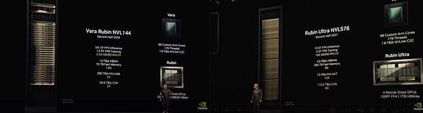 不過,黃仁勛也借這個場子預告了2026年上市的基于Rubin架構的下一代GPU以及更強的機柜VeraRubinNVL144——72顆VeraCPU+144顆RubinGPU,采用288GB顯存的HBM4芯片,顯存帶寬13TB/s,搭配第六代NVLink和CX9網卡。