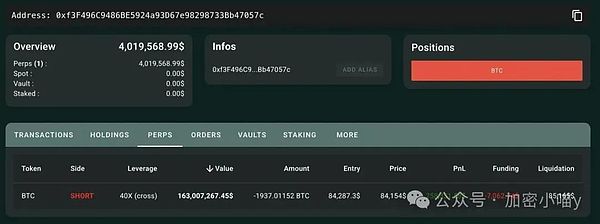 40倍杠桿在Hyperliquid上狙擊性布局BTC空單,累計(jì)持倉(cāng)規(guī)模達(dá)3.3億美元,最高浮盈觸及620萬(wàn)美元,后通過(guò)TWAP算法分批止盈560萬(wàn)美元;同期在GMX加碼44.97倍BTC空單,總規(guī)模1.94億美元,階段獲利305萬(wàn)美元。