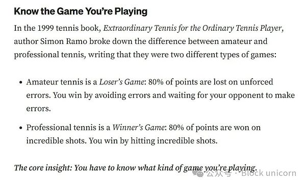 在第一種情況下,網(wǎng)球選手必須盡力減少失誤,因為只要做到這一點,他們就能擊敗大多數(shù)犯錯較多的對手。這是一個輸家游戲,因為比大多數(shù)人輸?shù)蒙倬湍茏屇愠蔀橼A家。