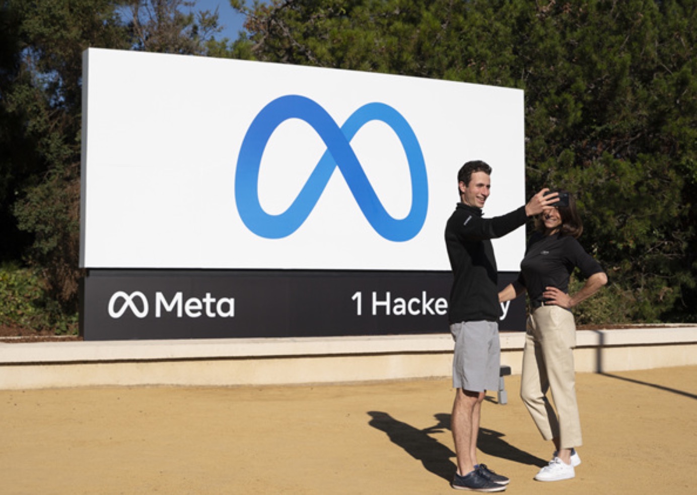 今年10月,美國社交媒體巨頭臉書宣布更名為“元”(Meta),聚焦元宇宙。圖為在美國舊金山灣區(qū),人們?cè)凇霸睒?biāo)志牌前留影。(圖片來源:新華社)