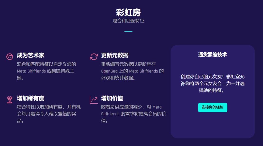 彩虹房,意思就是將2個元女友放進去,最后混合一個新的出來。按照官網的解釋,這能夠徹底減少元女友的總量,并隨著時間推移增加總體的價值。