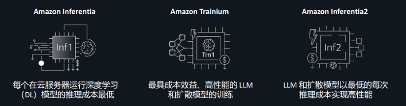 提供兩款專門針對生成式 AI 優化的高性價比虛擬機實例 EC2 Trn1n 和 EC2 Inf2,這兩款實例基于自研 AI 訓練 (Trainium) 與推理芯片 (Inferentia),能夠大幅節省企業的生成式 AI 訓練和推理成本;