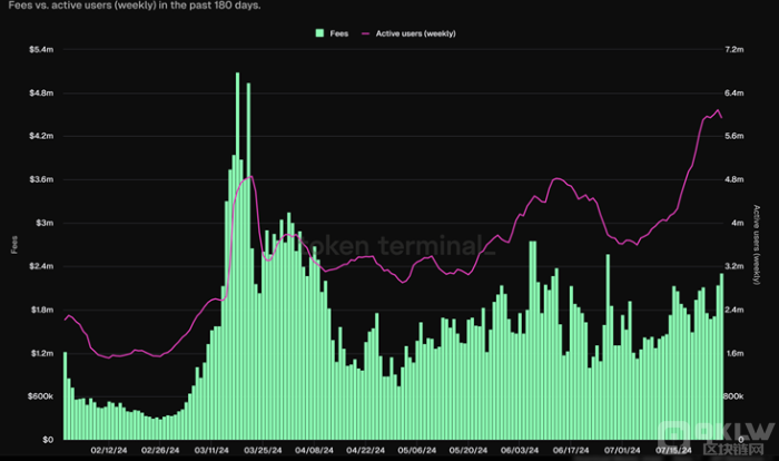 數據分析平臺Token Terminal顯示,Solana的每日和每周活躍用戶分別增加了21%和59%。活躍用戶數的增加與Jito和Marinade的TVL的增長同時發生。因此,可以推斷,memecoin并不是目前將用戶引入Solana網絡的唯一因素。