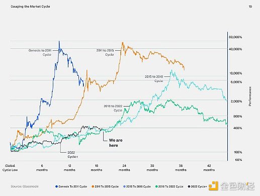 BTC已經(jīng)經(jīng)歷了4輪市場周期,各周期都有自己的牛市和熊市階段。本輪周期始于2022年,BTC價(jià)格較2022年11月的低點(diǎn)上漲了400%。本周期與2018-2022年周期類似,當(dāng)時(shí)BTC價(jià)格較低點(diǎn)上漲了2000%。