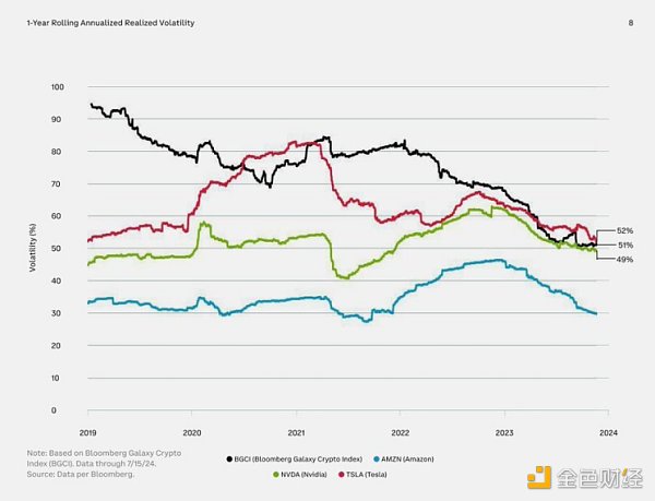 從感知角度講,對于許多投資者來說,數(shù)字資產(chǎn)的波動性太大。而現(xiàn)實(shí)情況卻是:crypto的波動性與一些被廣泛持有的大型科技股相當(dāng)。